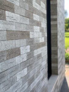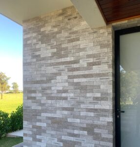 Composto por materiais reciclados, o produto também expressa a preocupação com a sustentabilidade — um valor essencial nos projetos contemporâneos. Sua versatilidade permite aplicações em fachadas, paredes internas, lareiras e áreas externas, sempre com o mesmo impacto estético: um charme rústico e sofisticado, que transforma superfícies em experiências táteis e visuais.