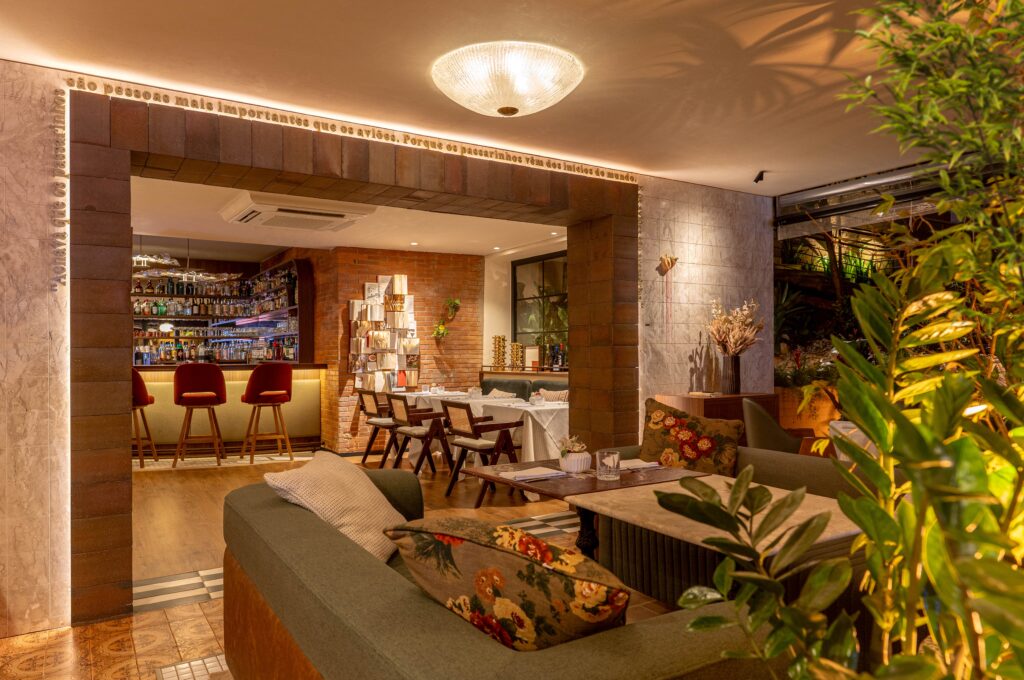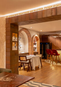 A madeira, os arcos, o mármore e os tons terrosos, bem como uma obra de arte muito especial, criada com livros antigos que se abrem e se insinuam sobre uma das muitas paredes de tijolos aparentes do espaço, criam um cenário que transborda afeto e autenticidade.