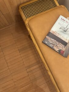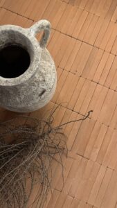 O uso do Due Vecchio no chão surpreende os visitantes da mostra. Acostumados a vê-lo revestindo paredes, deparam-se com sua força aconchegante expandida sob os pés, quase remetendo a um quintal ensolarado ou a uma área externa que invade o interior.