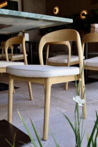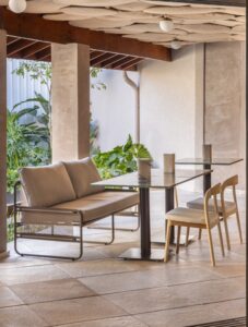 Na ampla varanda, a biofilia ganha protagonismo. A vegetação conecta interior e exterior, criando um refúgio natural que respira frescor e bem-estar. A proposta é de fluidez: os limites entre dentro e fora desaparecem, permitindo que a experiência gastronômica assinada pelo chef Gustavo Andrez se torne ainda mais especial em meio à luz natural e aos elementos orgânicos.