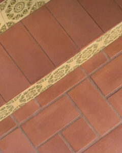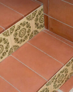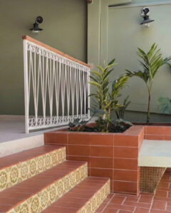 Na escada que leva ao patamar mais alto, a paginação muda. As lajotas entram alinhadas verticalmente, e um detalhe faz toda a diferença: os degraus e laterais da escada também são revestidos com a cerâmica.