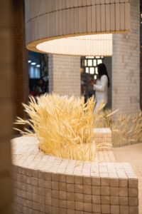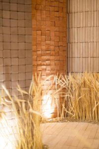 O jovem arquiteto goiano Marcos Lula, por sinal, é também quem assina o estande da Nina na feira, onde, além da beleza das linhas arquitetônicas, colunas e ângulos, um caminho inspirado em um delicado campo de trigo convida o visitante a desacelerar e vivenciar a matéria com o corpo inteiro. Mais do que uma exposição, o espaço se revela como uma experiência que conecta gesto, tempo e natureza, pilares que dão forma à Coleção Ciclos.