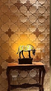 Na iluminação, insistiu em tons mais amarelados, abaixo de 2700K, para criar uma atmosfera calorosa, difícil de encontrar hoje. Nos pisos, preferiu desenhos delicados em vez de superfícies lisas. Nas ferragens, buscou o dourado tradicional. Cada escolha fazia parte da mesma intenção: recuperar a estética acolhedora que marcou gerações.