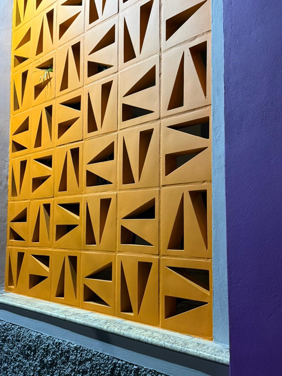A fachada ganhou os Cobogós Brise Clair & Sombre da Nina Martinelli. Aline optou por pintá-los num amarelo vibrante, em contraste com um tom lavanda utilizado nas paredes. E, ali, aconteceu algo bonito: o imóvel, antes discreto, ganhou presença. As peças vazadas, com formas geométricas que dialogam com o estilo industrial, juntamente com as cores, criaram uma nova profundidade visual, como se a fachada tivesse se expandido. Sem aumentar um único centímetro, ela ficou maior.