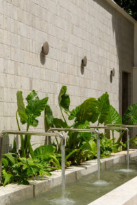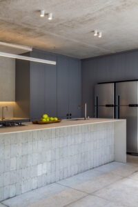 Já na área gourmet integrada ao jardim, o destaque é o Rettangolo Terracota Grigio 9x18cm. O tom cinza delicado remete ao concreto natural e dialoga diretamente com a estrutura do espaço, que mantém laje aparente e uma linguagem construtiva honesta. O revestimento se estende até a ilha do gourmet, criando continuidade e comunicação visual entre os elementos. Um painel de poucas linhas, mas de grande expressividade, que equilibra despojamento e sofisticação.
