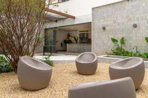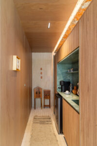 Ali, cada decisão projetual foi pensada para materializar aquilo em que Marcos acredita — e pratica — há 14 anos de atuação no mercado: uma arquitetura afetiva, conectada à natureza, respeitosa com a verdade dos materiais, com a ancestralidade e com a história que cada espaço carrega.