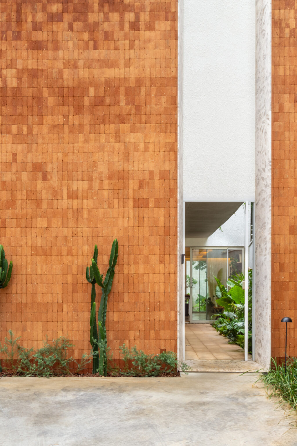 Na fachada, o arquiteto optou pelo Due Vecchio Terracota 7x13cm. As facetas cerâmicas, produzidas com materiais reciclados e submetidas a um processo duplo de queima, revelam textura rústica, nuances orgânicas e pontilhados que alternam tons terrosos e claros. Um revestimento potente, expressivo, que se impõe com elegância. “A fachada tem poucas linhas, então os materiais precisavam ser fortes, ter presença”, explica Marcos, reforçando sua crença na potência do material e na beleza da imperfeição natural. Daquilo em que Nina acredita e entrega: produtos Feitos Por Pessoas, Para Pessoas.