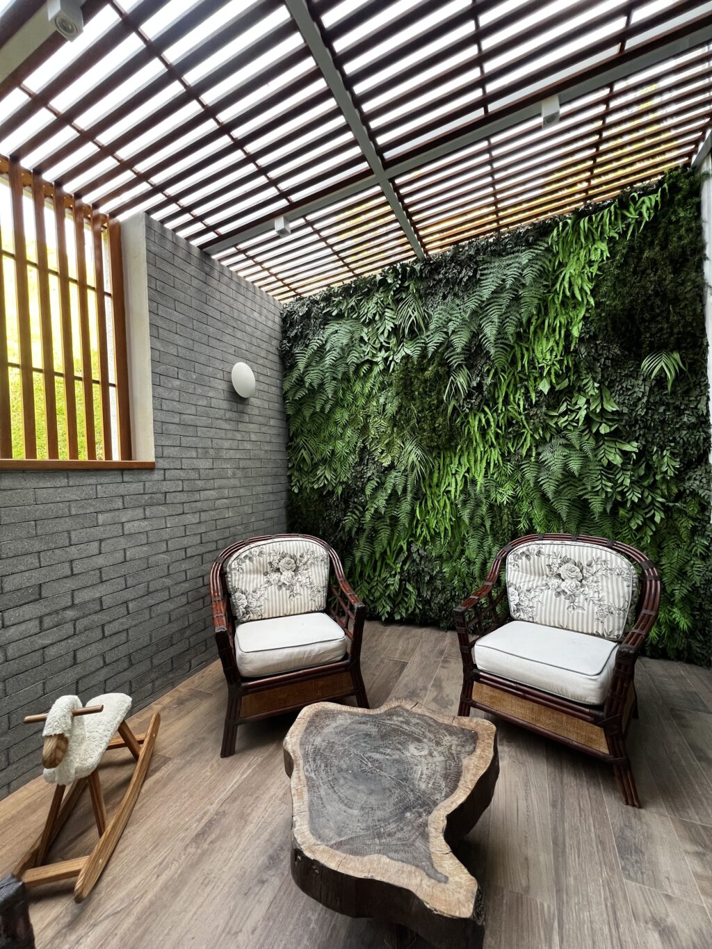 “O espaço foi pensado como um cantinho de conversa, de interação entre as pessoas. Um lugar para estar junto”, explica a arquiteta. “O resultado ficou lindo e exatamente como os clientes esperavam.”, diz Carol. “A textura do brick, aliada à luz natural filtrada pelo vidro, cria um ambiente acolhedor, convidativo e cheio de personalidade”, complementa.