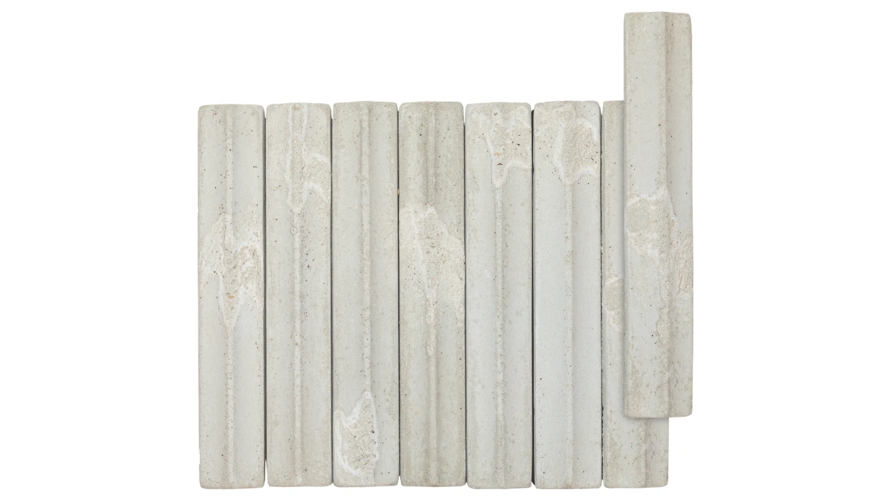 Peças alongadas de topo em forma de vértice suavizado, feitas de base argilosa, que passam por duplo processo de cura e cuidadosa corrosão controlada, resultando em superfícies e arestas de aspecto naturalmente envelhecido pela história e pelo correr do tempo.