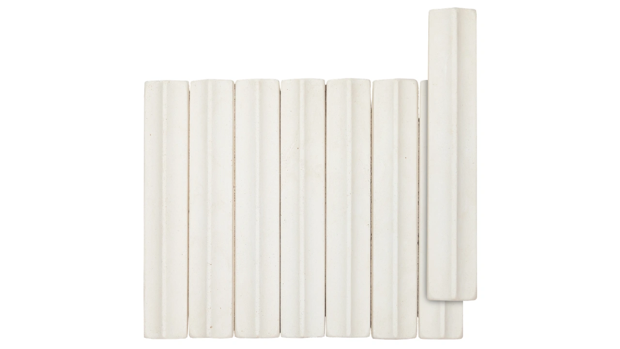 Peças alongadas de topo em forma de vértice suavizado, feitas de base argilosa, que passam por duplo processo de cura e cuidadosa corrosão controlada, resultando em superfícies e arestas de aspecto naturalmente envelhecido pela história e pelo correr do tempo.