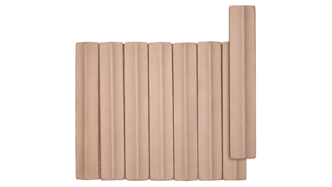 Peças alongadas de topo em forma de vértice suavizado, feitas de base argilosa, que passam por duplo processo de cura e cuidadosa corrosão controlada, resultando em superfícies e arestas de aspecto naturalmente envelhecido pela história e pelo correr do tempo.