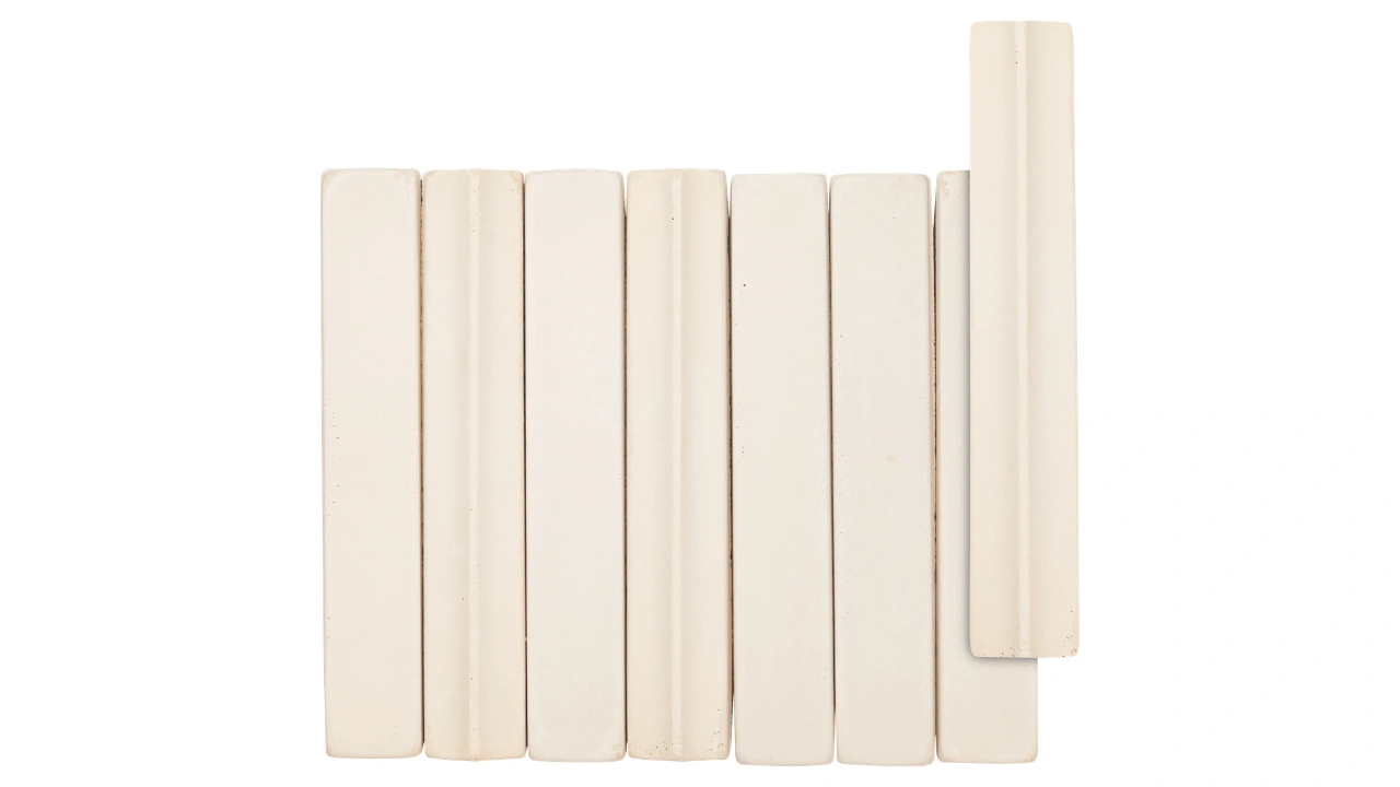 Peças alongadas de topo em forma de vértice suavizado, feitas de base argilosa, que passam por duplo processo de cura e cuidadosa corrosão controlada, resultando em superfícies e arestas de aspecto naturalmente envelhecido pela história e pelo correr do tempo.