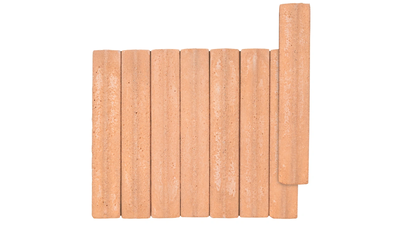 Peças alongadas de topo em forma de vértice suavizado, feitas de base argilosa, que passam por duplo processo de cura e cuidadosa corrosão controlada, resultando em superfícies e arestas de aspecto naturalmente envelhecido pela história e pelo correr do tempo.