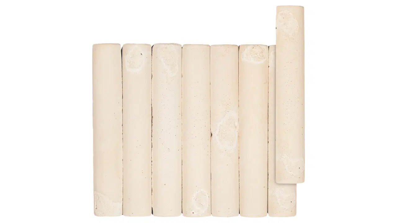 Peças alongadas em topo em forma suavemente arqueada, feitas de base argilosa, que passam por duplo processo de cura e cuidadosa corrosão controlada, resultando em superfícies e arestas de aspecto naturalmente envelhecido pela história e pelo correr do tempo.