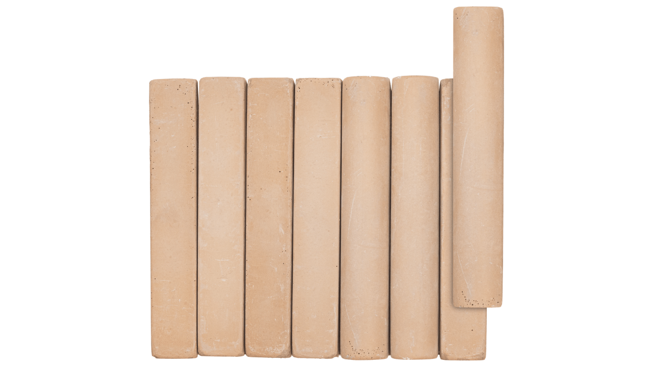 Peças alongadas em topo em forma suavemente arqueada, feitas de base argilosa, que passam por duplo processo de cura e cuidadosa corrosão controlada, resultando em superfícies e arestas de aspecto naturalmente envelhecido pela história e pelo correr do tempo.