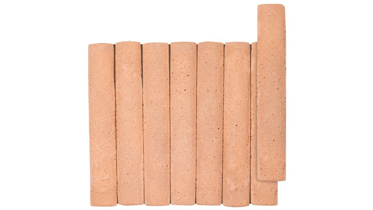 Peças alongadas em topo em forma suavemente arqueada, feitas de base argilosa, que passam por duplo processo de cura e cuidadosa corrosão controlada, resultando em superfícies e arestas de aspecto naturalmente envelhecido pela história e pelo correr do tempo.