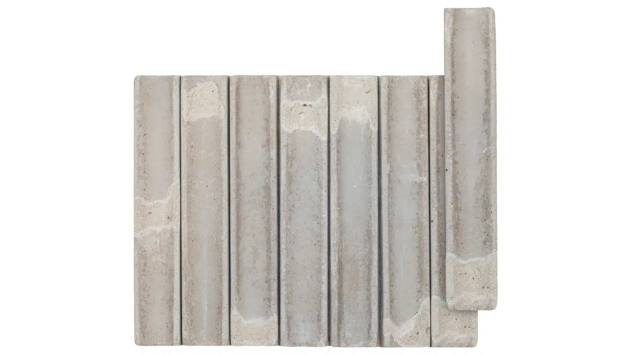 Peças alongadas em topo em forma delicadamente côncava, feitas de base argilosa, que passam por duplo processo de cura e cuidadosa corrosão controlada, resultando em superfícies e arestas de aspecto naturalmente envelhecido pela história e pelo correr do tempo.