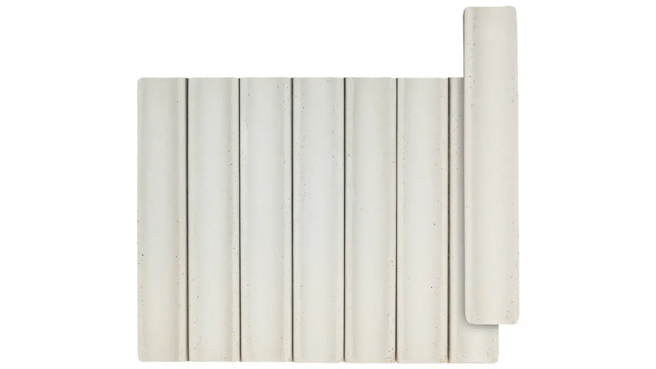 Peças alongadas em topo em forma delicadamente côncava, feitas de base argilosa, que passam por duplo processo de cura e cuidadosa corrosão controlada, resultando em superfícies e arestas de aspecto naturalmente envelhecido pela história e pelo correr do tempo.