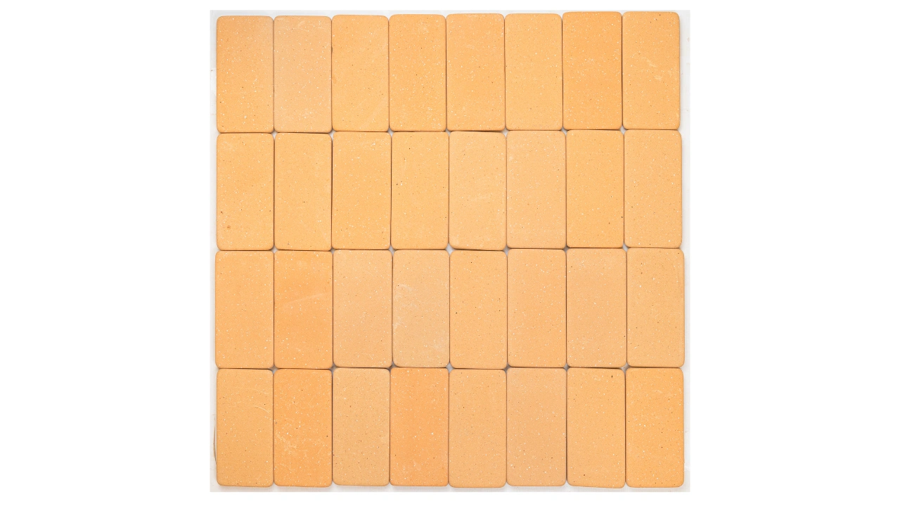 Peças em cerâmica natural, que passam por processo duplo de queima e cuidadosa corrosão controlada, resultando em superfícies e arestas de aspecto naturalmente envelhecido pela história e pelo correr do tempo.
