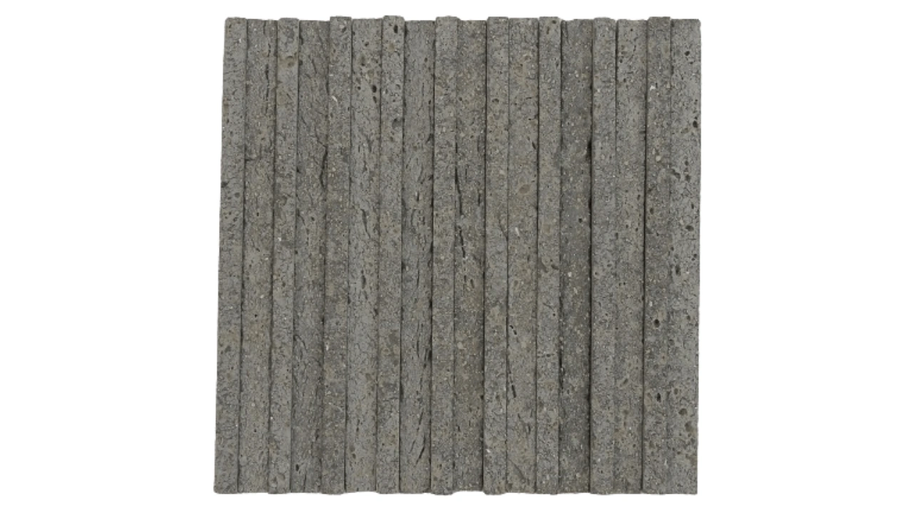 Filetes em cerâmica rústica em formatos e relevos diferenciados dispostos paralelamente e organizados em placas teladas