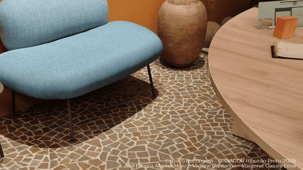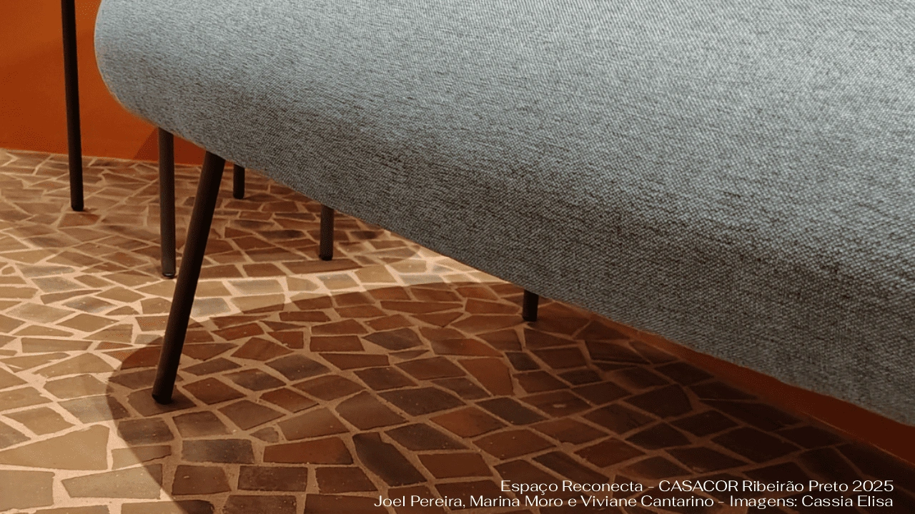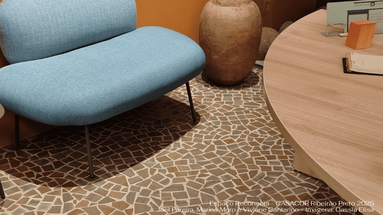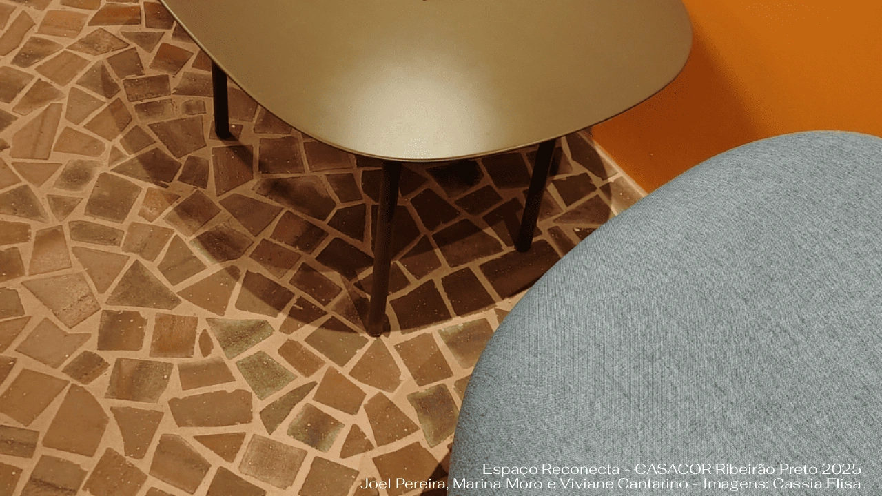 A Nina Martinelli criou uma releitura dos cacos de cerâmica aplicados em pisos de residências da década de 50. É um produto sustentável, pois é feito através da reutilização das sobras da fábrica que se transformam em um belo revestimento indicado para pisos e fachadas.
