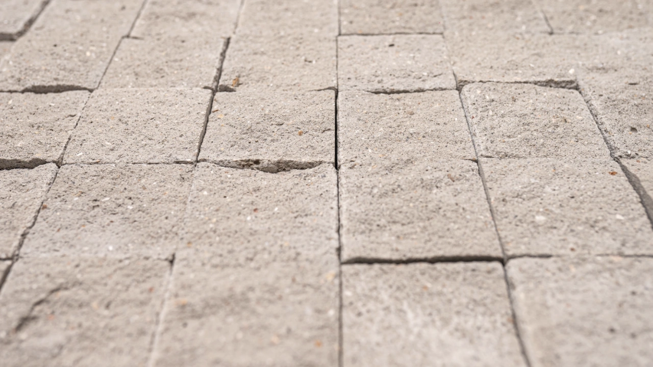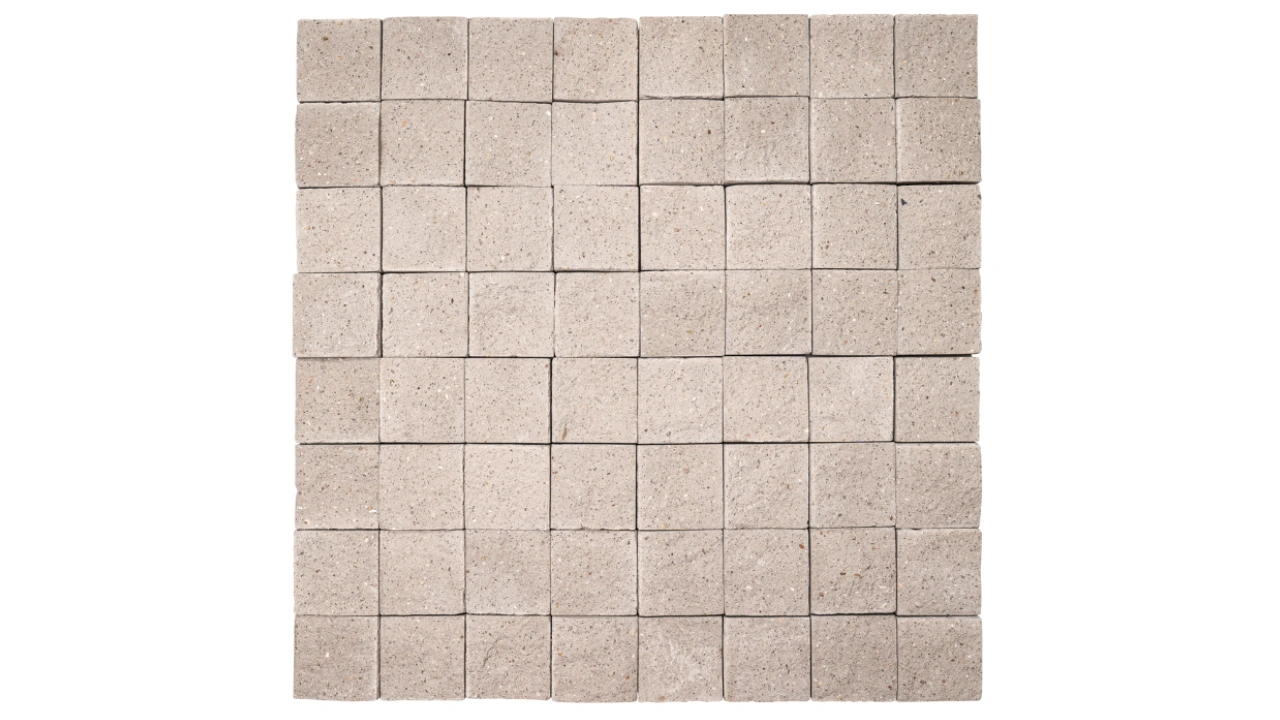 Revestimento quadrilátero medindo 7x7cm, cortado em aspecto de pedra, em dimensão reduzida para permitir uma paginação simétrica, em que os detalhes se sobressaem, no caso, a alternância de relevos típicas de pedras naturais.