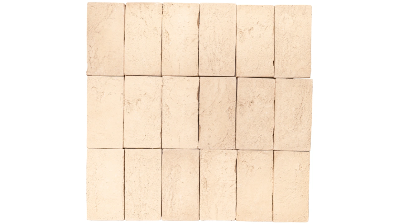 Peças medindo 9x18cm feitas uma a uma, com bordas regulares e superfície irregular que remete às paredes rochosas ou trilhas de rocha natural, com as variações de relevos esculpidas pela passagem do tempo ou pela fragmentação natural dos elementos. Confere beleza, força e naturalidade aos ambientes e com a paginação simétrica, amplia a sensação visual de aspecto orgânico.