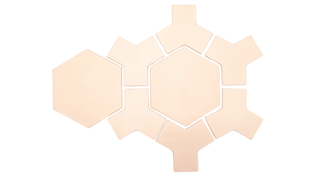 Peças medindo 30×34 cm que são compostas por um elemento sextavado e elementos em formato de Y criando uma moldura elegante e uma padronagem que denota sofisticação e atemporalidade.