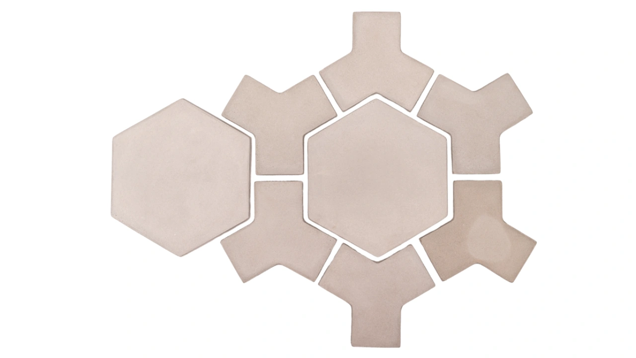 Peças medindo 30×34 cm que são compostas por um elemento sextavado e elementos em formato de Y criando uma moldura elegante e uma padronagem que denota sofisticação e atemporalidade.