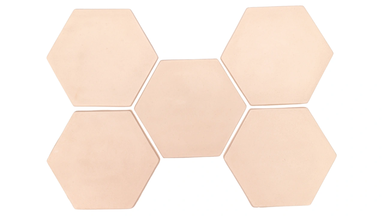 Peças em formato sextavado, que exploram a harmonia dessa figura geométrica, possibilitando a criação de um padrão visual clássico e, ao mesmo tempo, ousado. Rico e limpo, apropriado para dar leveza com diferenciação aos ambientes.